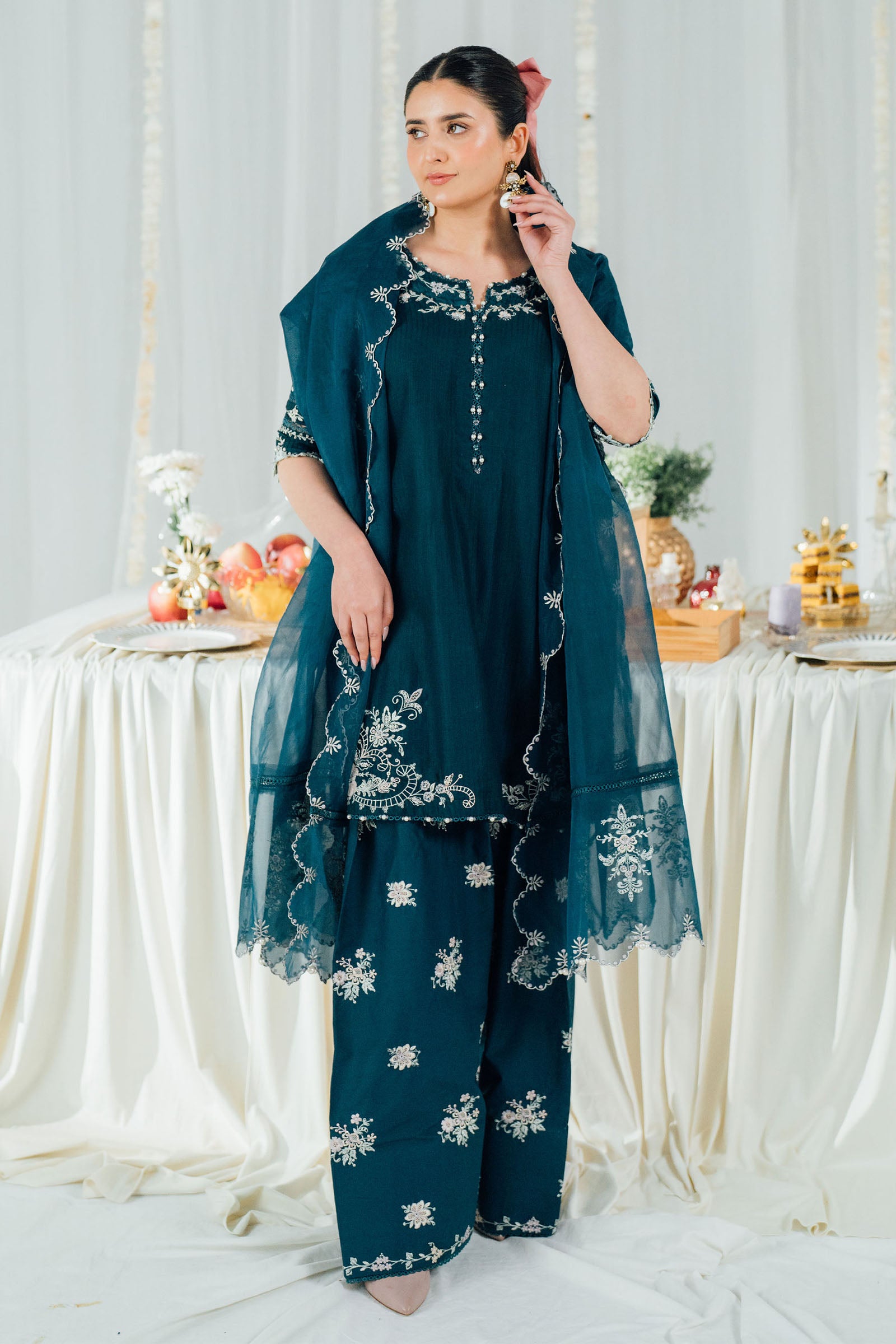The shirt features intricate embroidery with lace detailing - organza detailing along the neckline, while hand-finished accents on the sleeves, border & neckline add artisanal charm. The traditional farshi shalwar is adorned with delicate embroidered floral patterns, lending a graceful flow to the silhouette. Paired with an ethereal organza dupatta, embellished with four-sided scalloped embroidery, pearl detailing, and intricate motifs.