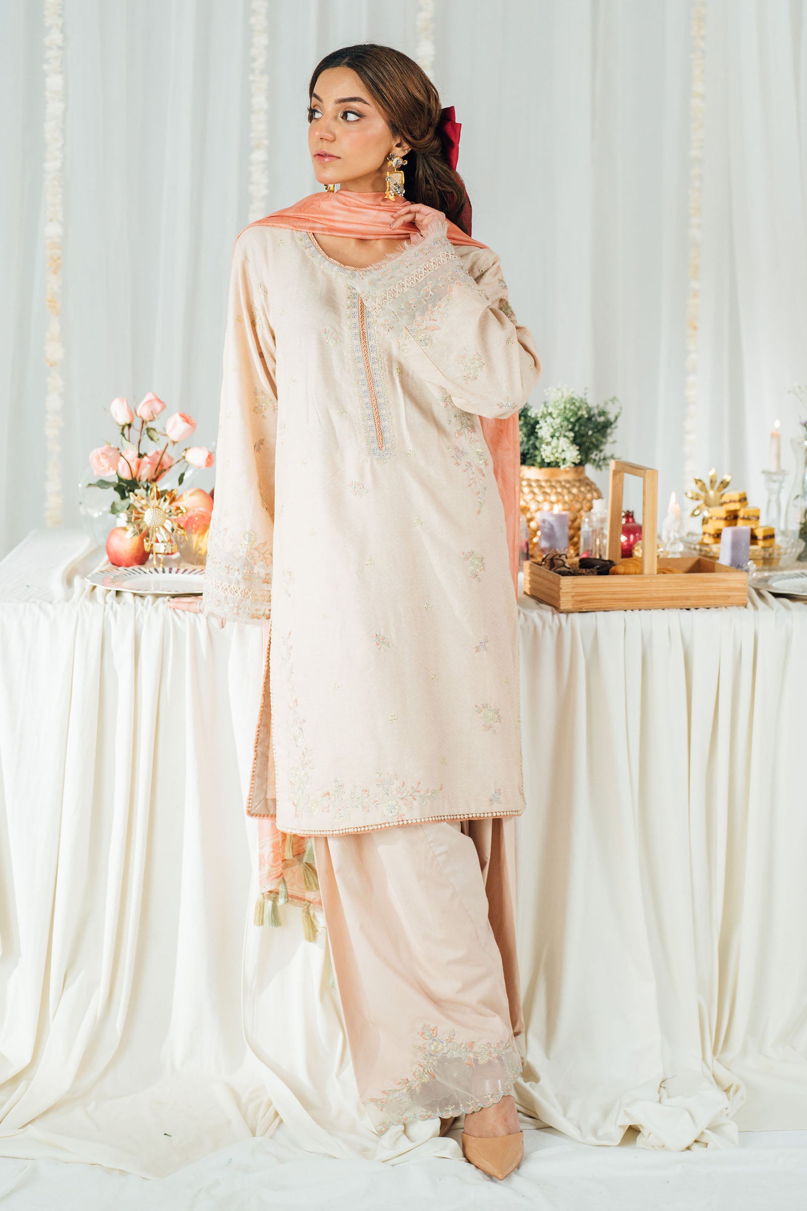 The shirt features intricate embroidery with lace and organza detailing, enhanced by delicate handwork on the sleeves for a refined, artisanal finish. Paired with a gracefully flared farshi shalwar, accented with embroidered organza detailing, the silhouette captures timeless charm. A printed silk dupatta with handmade tassel finishing completes the look.