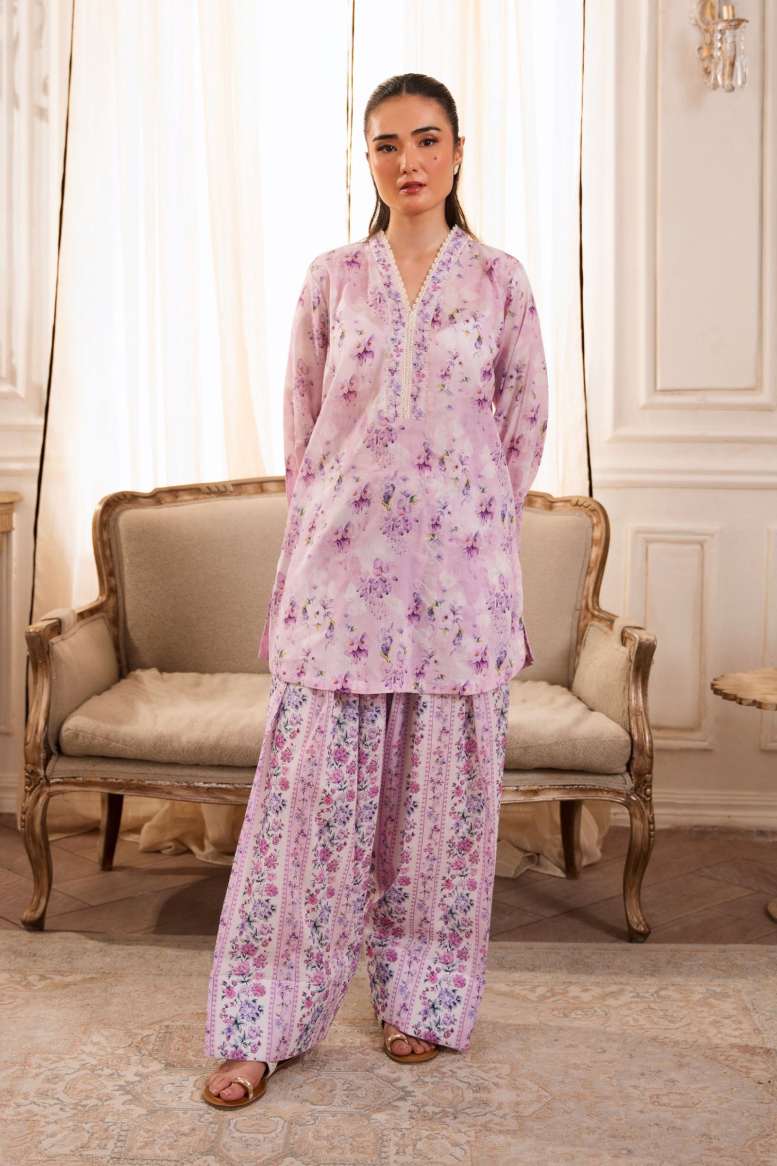 A breath of fresh air in the summer heat Lilac Bloom is a dreamy blend of comfort and charm. The soft lilac shirt features a soothing, summery print, beautifully contrasted with a uniquely printed farshi shalwar for a playful twist. The neckline is adorned with dainty lace detailing, while the wide open sleeves showcase minimal yet elegant embroidery. It's the perfect outfit to keep you looking graceful and feeling light all season long.