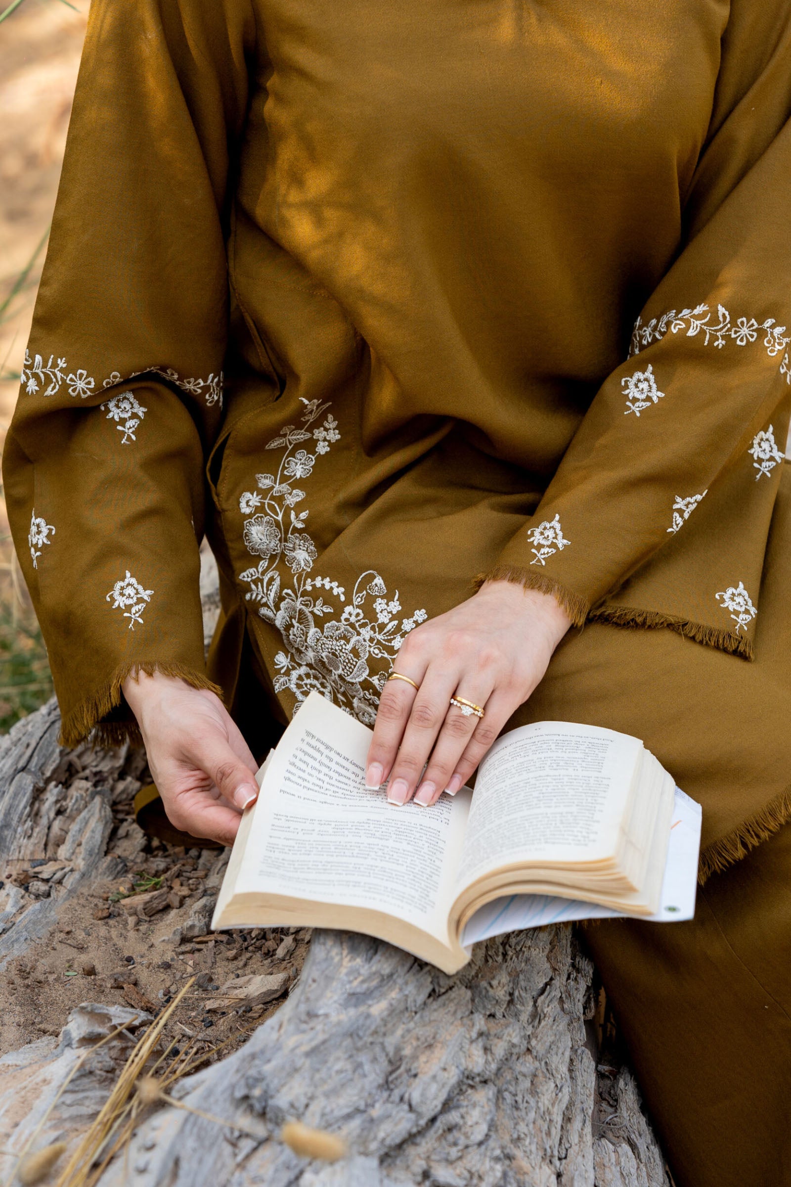 A chic two-piece olive green outfit crafted from soft marina fabric. The ensemble features delicate embroidery along the sides and elegant bails adoring the sleeves, adding a touch of sophistication.