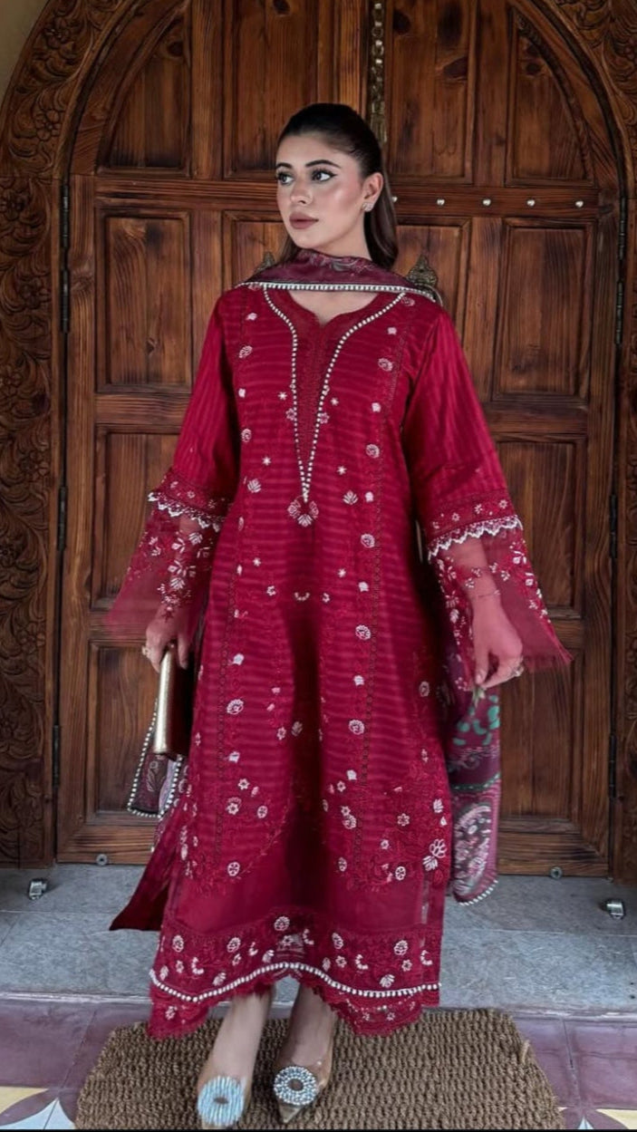 This three-piece set in a bold red hue features a delicately embroidered shirt with organza accents and patchwork at the hem. The trousers carry lace detailing and subtle embroidery, adding soft texture, while the printed dupatta with lace finishing brings balance and flow to the ensemble.